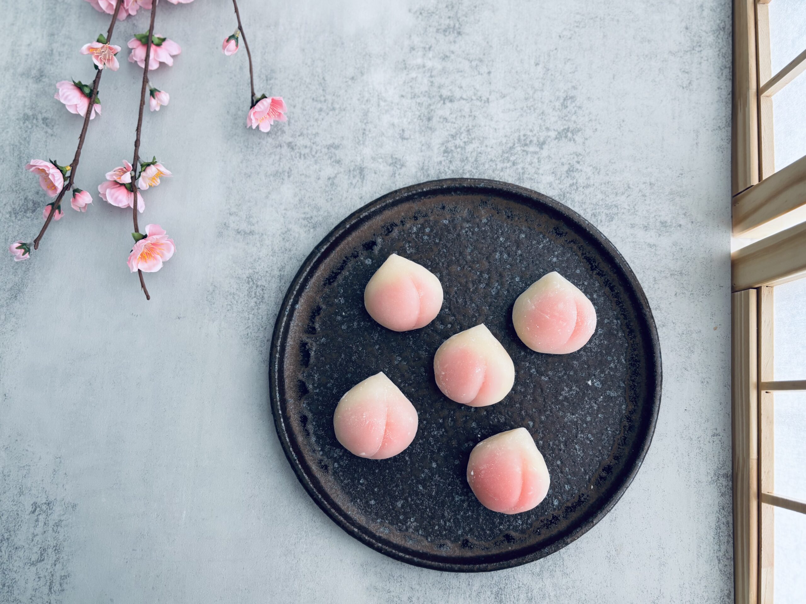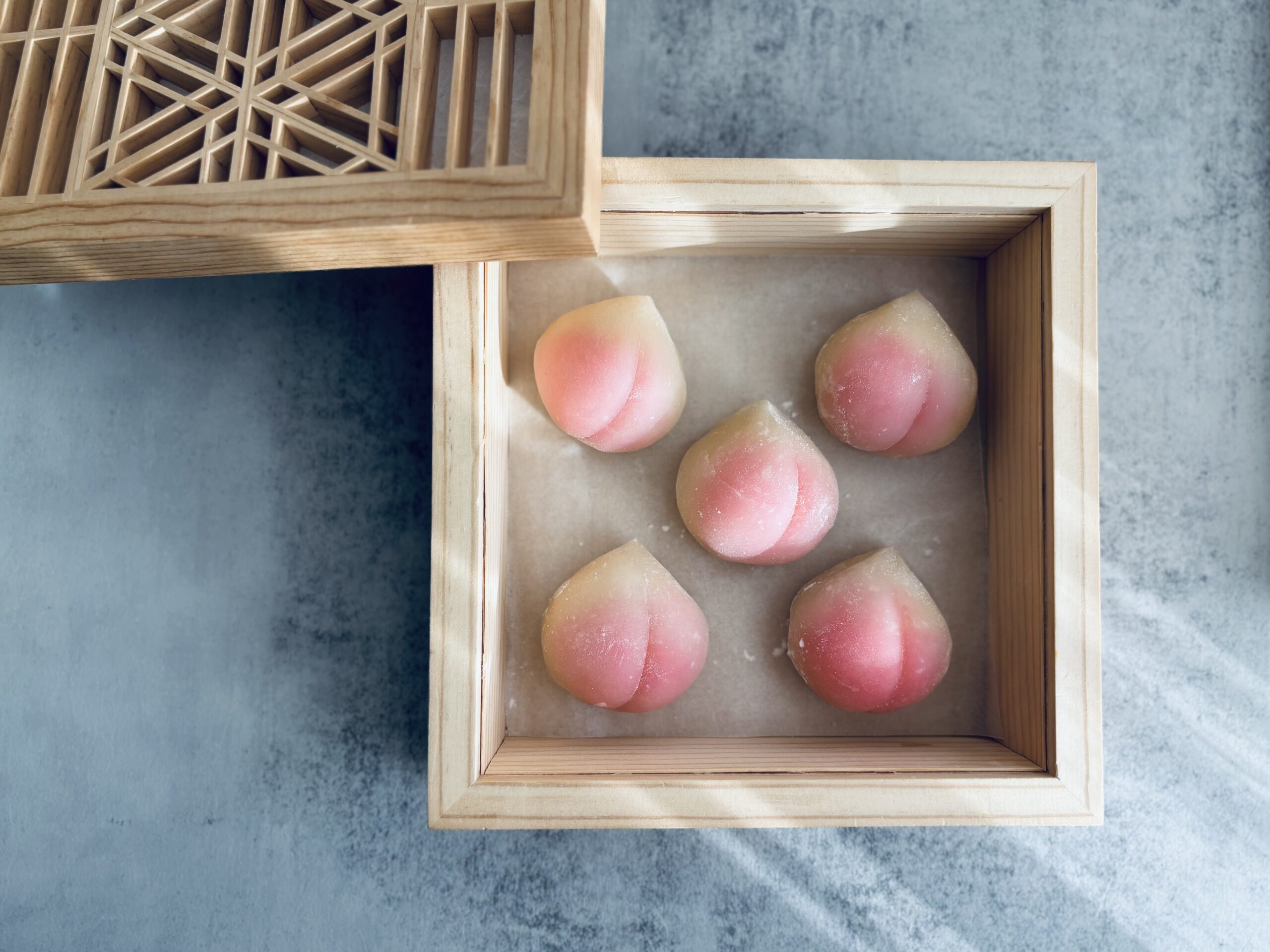 Created together with my students as the March confection in our 12-month wagashi course, this peach-shaped sweet celebrates Hinamatsuri on March 3rd. Inspired by the legendary peaches of immortality associated with Seiobo, the Queen Mother of the West, it carries wishes for protection, longevity, and gentle growth. Soft, delicately steamed uirō encases a smooth yolk-infused white bean paste, its tender hues reflecting the quiet arrival of spring. Through this shared creation, I hope to express blessings for renewal and for young girls stepping into a bright new season.